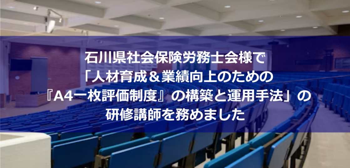 石川県社会保険労務士会様で「人材育成&業績向上のための『A4一枚評価制度』の構築と運用手法」の研修講師を務めました! 2025年11月10日 活動報告 Nagaya 11月6日(木)、石川県社会保険労務士会様にて弊社の榎本が研修講師を務めました。 ご参加いただいた皆さま、ありがとうございました!